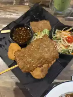 The **Blue Chang Mixed Platter** was even more amazing. It came with Thai shrimp patties, fish cakes, green papaya salad, and BBQ pork satay. Every bite was a different surprise! The refreshing green papaya salad was especially refreshing, perfectly relieving the greasiness and rounding out the entire dining experience! 🥗