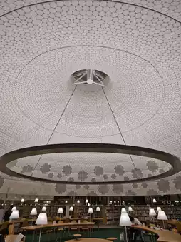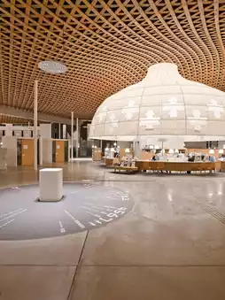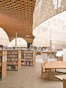It features a unique design resembling a large umbrella, and the library's generous use of wood creates a warm and inviting atmosphere. 😌