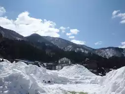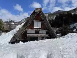 Traditional Gassho-style houses with prayer-hands shaped roofs, covered in snow during winter, resembling scenes from Japanese cartoons 🍃⛩️