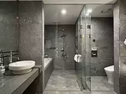 Each bathroom has a bathtub, shower booth, toilet, and sink, so it's really convenient.