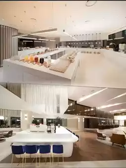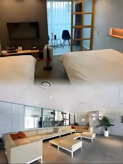 The "Suspended Tea Room" in the hotel atrium took this fluid aesthetic to the extreme. Six transparent capsule rooms hung suspended within a ten-meter-high water curtain, with servers delivering matcha and Korean fruit via cable car. As the afternoon sun pierced the double water curtain, the light spots refracted onto the cypress tea tables changed shape with the fluctuating water levels, resembling a microcosmic wave performance.