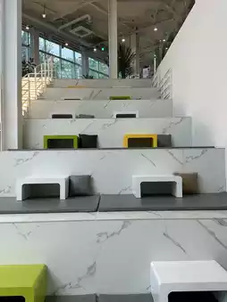 The interior is clean and features a white-toned design, complemented by plants placed throughout and large windows that let in plenty of natural light, creating a warm and inviting atmosphere. Notably, the café is well-equipped with facilities like a dedicated seating area for toddlers, a nursing room, and a diaper changing station, making it an excellent spot for family visitors.