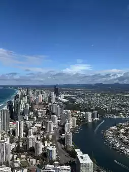 Our adventure began at the Q1 Building's SkyPoint Observation Deck. Ascending to the 77th floor in a matter of seconds, we stepped out into a 360-degree panoramic view that is simply breathtaking. To the east, the vast expanse of the Pacific Ocean unfolds in every shade of blue, with the iconic surf beaches stretching as far as the eye can see. To the west, the green tapestry of the hinterland mountains provides a stunning backdrop. It’s from this viewing platform that you truly appreciate the unique cityscape of towering high-rises nestled between the ocean and the hills.