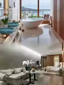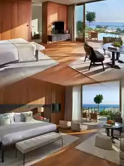 🏠 The hotel's architecture blends local characteristics with modern aesthetics. The cream-colored buildings are arranged harmoniously, complementing the surrounding blue sea and sky. The interior design of the rooms is exquisite and luxurious, with every detail showcasing quality. From the soft bedding to the carefully selected furniture and smart amenities, every moment is filled with ultimate comfort and care.