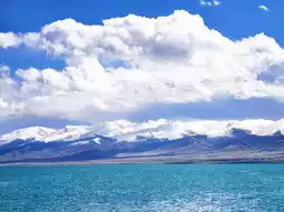 Snow-capped mountains and grasslands surround the lake, contributing to its striking natural beauty.