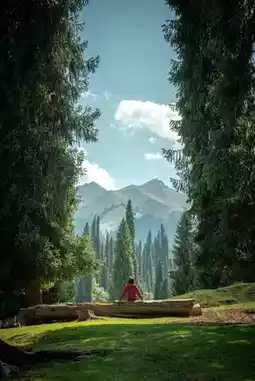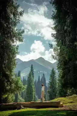 ⢠Bring picnic mat and food, spread under the King Spruce tree, background with snow mountain and cattle and sheep.