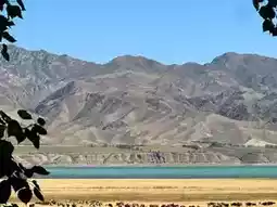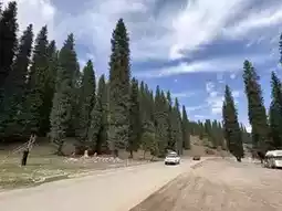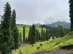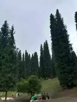 Background: dense spruce forests and snow-capped Tianshan peaks, adding drama and depth.