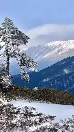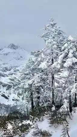 Upon arriving at Peacock Mountain, I was greeted by a scene of pristine beauty after a fresh snowfall. The mountains were gently covered in snow, resembling a maiden draped in a rose-colored veil, gentle and serene. Sunlight pierced through the clouds, and the snow reflected diamond-like sparkles, dazzling yet captivating. The distant "Tianxin Twelve Lakes" were as clear as mirrors, reflecting the snow-capped mountains and the blue sky. The interplay of light and shadow created a dynamic, ink-wash painting-like scene.