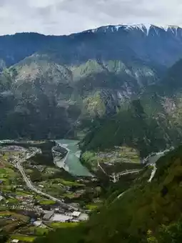 Conveniently roadside near town, this classic vantage point frames the serpentine river, scattered villages, and distant snow peaks. The modern township below slightly diminishes the imagined mystique.