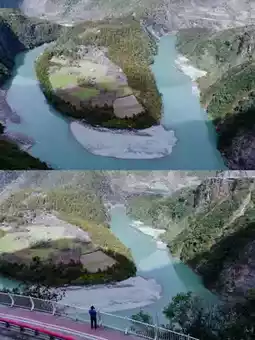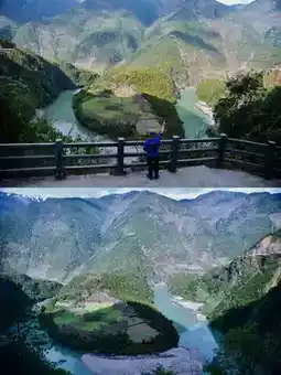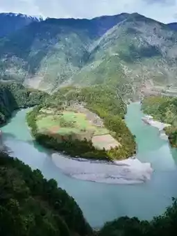 Bingzhongluo's iconic landmark where the river forms a near-perfect Ω-shaped curve. Emerald waters wind through emerald hills—the aerial view showcases nature's masterpiece. Warning: strong canyon winds make drone flying challenging.