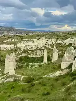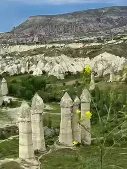 The path wound between towering fairy chimneys, their shapes both surreal and strangely beautiful. Spring had painted everything green — soft grass under my feet, wildflowers blooming in every corner, and birds singing above like a quiet soundtrack to my thoughts. There was a calm here that I didn’t even realize I needed.