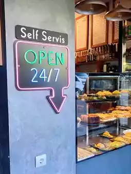 A recommended 24-hour cafe in Göreme, Cappadocia. We visited the cafe twice: once for a lunchtime break during a stroll, and once early in the morning after photographing hot air balloons on a hill within walking distance of Göreme city center.