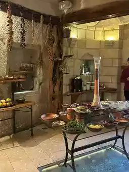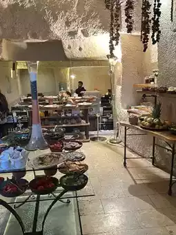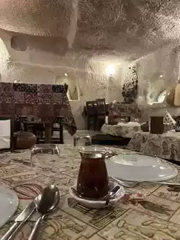 Breakfast is served in the cave restaurant, where fresh juices and traditional Turkish cuisine are served amidst sun-drenched stone arches.