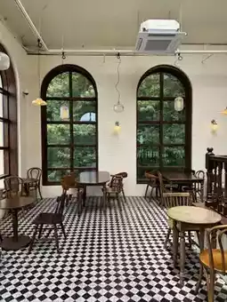 This café is housed in a spacious standalone building, featuring yellow walls and large windows that make it stand out ✨
