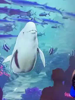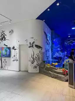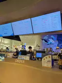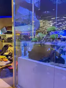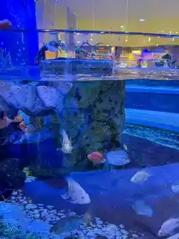 Enjoy a leisurely cup of coffee while observing various fish in the aquarium that you can enjoy with your kids.