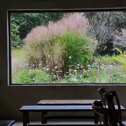 The large windows frame the swaying cosmos flowers like a painting, giving the feeling of gazing at an autumn landscape ๐จโจ