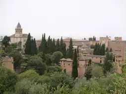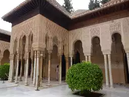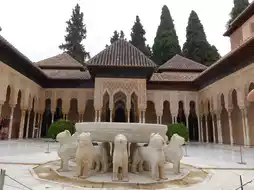 The Alhambra Palace, located in the southern Spanish city of Granada, is a palace and fortress built by Moorish kings. Its name means 'The Red Castle.' The site consists of two main architectural complexes: the Court of the Myrtles and the Court of the Lions.