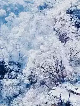 The trees in the mountains are also dressed in white, with branches bent by the snow, like strings of crystal clear crystal bead curtains, swaying gently in the breeze, making a crisp and pleasant sound, as if the snow elves are singing softly. The sun shines down, and the snowflakes sparkle with fine light, making the whole mountain forest shine, beautiful and breathtaking.
