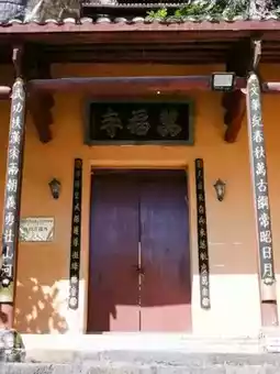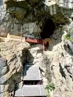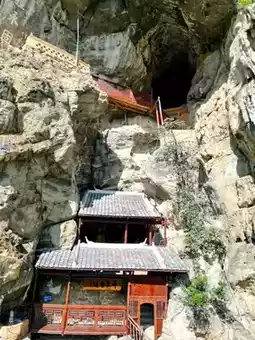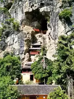 This unique temple is built into the mountainside, with **cloud-ladder bridges winding through the air**—it’s one of Guangxi’s most famous **grotto temples**, called **"Wanfu Temple"**.