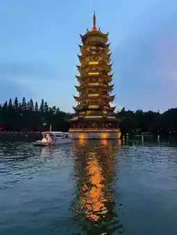 #chinatravel Checked out the Sun and Moon Twin Pagodas in Guilin and they were honestly super cool, especially at night. The pagodas sit right on the water and light up in gold and silver, which looks amazing with the reflections in the lake. It is a great place to just take a stroll, snap some photos, and enjoy the relaxed vibe. The whole area around the lake is really pretty and peaceful, with bridges, trees, and places to sit and chill.
