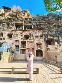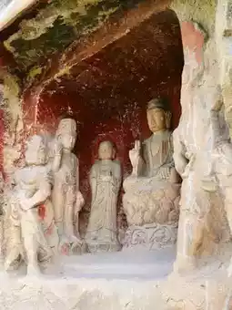 The top of the cave is carved with a huge lotus flower, which is magnificent. The cave is carved with the Three Buddhas: Amitabha, Shakyamuni, and Maitreya, among which Maitreya is the incarnation of Wu Zetian, the background of the time.