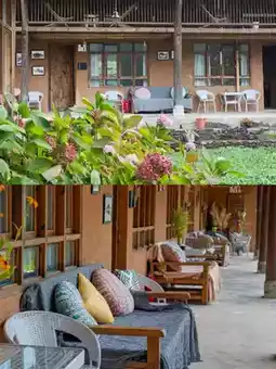 The courtyard faces the mountain ⛰️ and consists of three single-story houses, one for accommodation (10 rooms in total), one for a coffee ☕ shop (restaurant), and one for a kitchen (restaurant), all clean and beautiful.