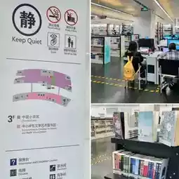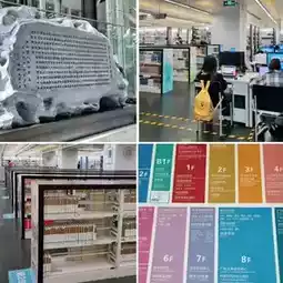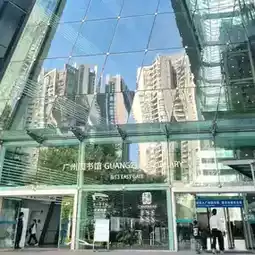 The library is a vast and modern facility with views of the Canton Tower, featuring multiple floors with amazing architectural design.