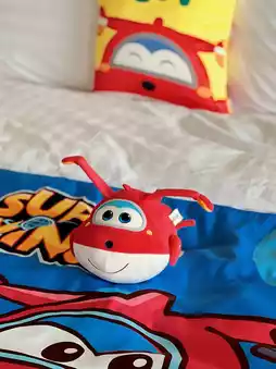 The decoration of the room is Super Flying themed.