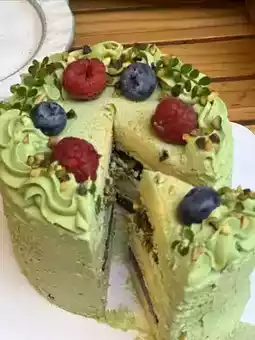 The top is decorated with raspberries, blueberries, and crushed pistachios.