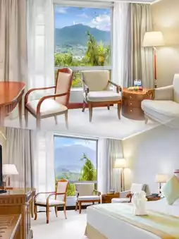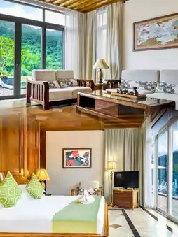 The room types are super varied, especially the round view queen room, which has a floor-to-ceiling window that offers a panoramic view of the stream and riverside scenery.
