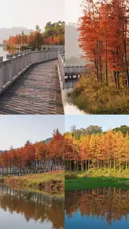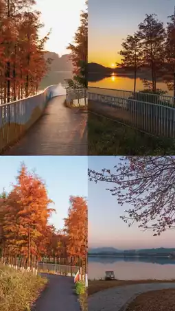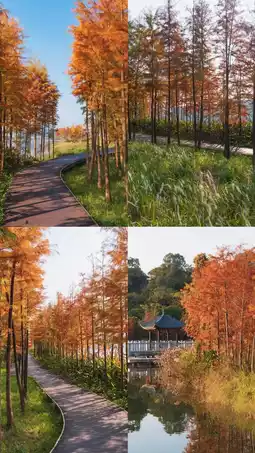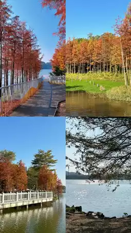 • The row of bald cypress trees by Lihu, along with the nearby orange-yellow grass and distant evergreen trees, create a stunning contrast. Under the sunlight, their shadows are reflected on the mirror-like river, resembling a vibrant oil painting.