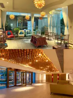 🥬 The hotel uses a more modern style in the garden and the windows and lighting of the building. Outside, there are large lawns and tranquil and elegant waterscapes. The building has floor-to-ceiling windows everywhere, extending the accommodation experience from indoors to outdoors.