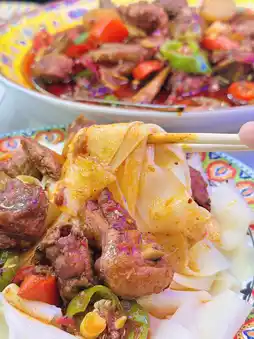 The flat noodles are chewy and absorb the sauce of the big plate chicken, spicy and satisfying🔥