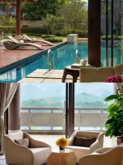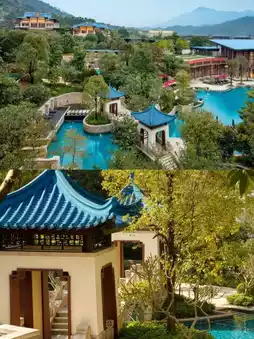 Located in Conghua, Guangzhou, with Phoenix Mountain behind it, it has 2.8 million square meters of beautiful garden scenery. The entire park is lush with trees and gurgling water. The entire building integrates the style of Hanting Tang Palace and is carefully built by the world's leading hotel design company. The manor has 90 Tongquantai suites and more than 30 courtyard-style villas. Each suite is equipped with an independent hot spring pool, jacuzzi and terrace, and the private space is luxurious.