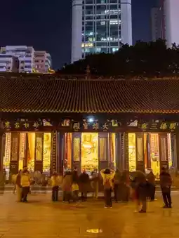 Beijing Pedestrian Street is a place for shopping. There is a big Buddhist temple inside.