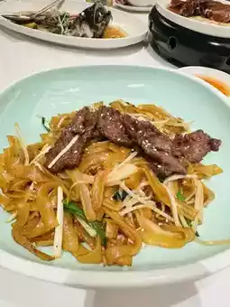 If you come to Guangzhou, you have to try Tao Tao Ju, right? And if you try Tao Tao Ju, you have to try the main branch, right? Today, my Guangzhou friend treated me to a meal at this time-honored restaurant! When I arrived at the entrance, I saw that the restaurant was huge, seemingly five or six stories high, and there were still people waiting in line at the door. My friend had gotten a number in advance, so we went straight to the fourth-floor dining hall. The dishes were served quickly. The roast goose was the most satisfying, and there were also the tangerine peel beef balls that I especially like. It was also my first time trying sweet and sour pork served on ice, and I have to say, it tasted better than the hot version. Finally, we had a serving of dry-fried beef ho fun! Perfect! But I also have to mention a few of the waiters here. Is the service in all old restaurants like this? They seemed a bit indifferent, and I had to repeat things many times. Isn't Guangzhou's service level supposed to be the national benchmark?