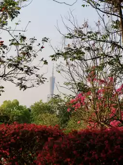 There is a magical camera position when you enter the park and walk half a circle around the lake, where you can see the seasonal sea of flowers and the Guangzhou Tower.