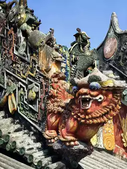 The detailing was exquisite. Every corner seemed to hold a story—whether it was the delicate lattice window panels, the symbolic stone carvings, or the majestic doors framed with mythological motifs. What stood out most were the richly colored ceramic sculptures lining the roof ridges: dragons, phoenixes, and scenes from Chinese folklore, each one animated with life and movement.