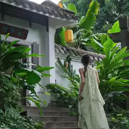 Sitting on the stone, taking photos of Chinese-style buildings and greenery