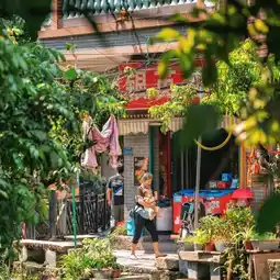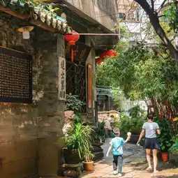 - This serves as the landmark entrance! The combination of gray bricks, green tiles, and red lanterns instantly transports you back in time. The stone bench on the side is perfect for capturing a nostalgic silhouette.