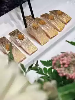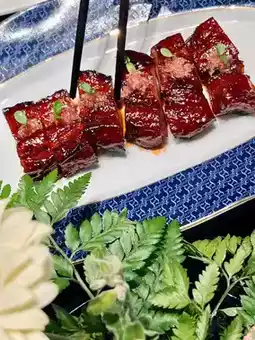 Marinated with rose liqueur, you can taste a faint rose flavor when you eat it. The barbecued pork has alternating layers of fat and lean meat! Not greasy at all!