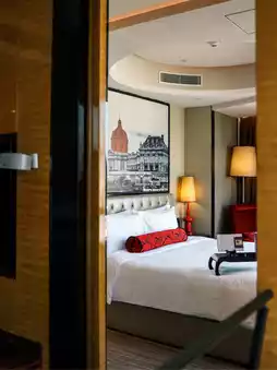 The Premium Queen Room on the 38th floor seems to have been enchanted, with modern Parisian metallic lines wonderfully blending with Chinese-style red-painted chests. The night view of Tianhe CBD outside the floor-to-ceiling window is like a river of stars pouring over.