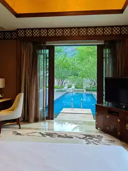 🏡 The villas completely fulfill the Chinese imagination of a luxury vacation estate, starting at two to three hundred square meters. Past the reception room lies a azure swimming pool framed by lush greenery 🏊🏻♀️ Each comes with a private sauna and hot spring bath.