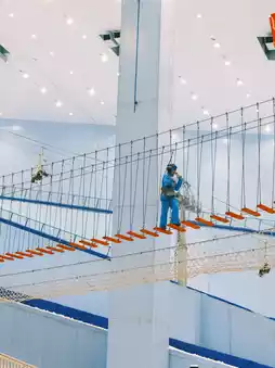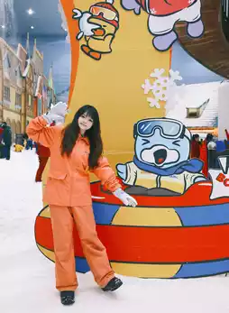 Put on the free snowsuit, snowshoes, snowboard 🏂, and auxiliary tools such as helmet and ski pole ⛷.