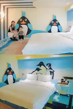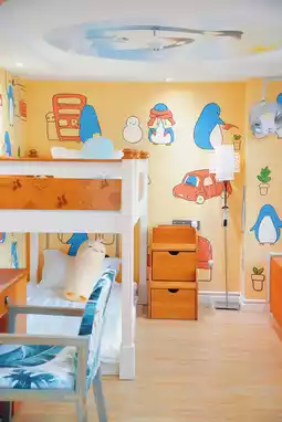 🔹 Stay in a penguin suite with a slide. The loft duplex space is spacious and comfortable, with a queen-size bed + bunk bed that can accommodate 4 adults.