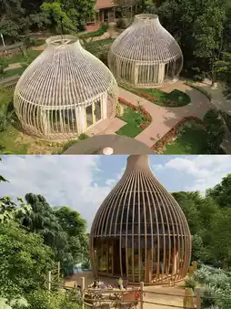 ✨ Treehouse Zone: Mushroom/shell-shaped log cabins