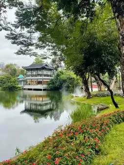 Rent a wooden boat to drift across the lake, watching Xiaocui Pavilion's reflection shatter into shimmering ripples, and gaze up at century-old banyan trees with cascading aerial roots like curtains when passing under Rainbow Bridge.
