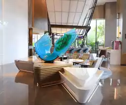 Stepping into the lobby of Guangzhou Nansha Jinmao Marriott Hotel, the suspended sailboat art installation instantly draws the eye toward the 5-meter-high ceiling. The flowing curves on the blue glass curtain wall resemble rolling waves, while sunlight reflecting off the Jiaomen River pours in through the floor-to-ceiling windows.
