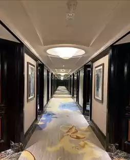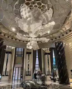 Stepping into the lobby, you're greeted by beige marble floors, cascading crystal chandeliers, and symmetrical spiral marble staircases winding upwards – the entire space simply glitters.