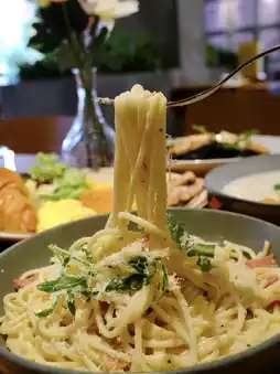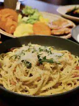 Just the right amount of mushrooms adds a touch of freshness It is a classic among pastas~